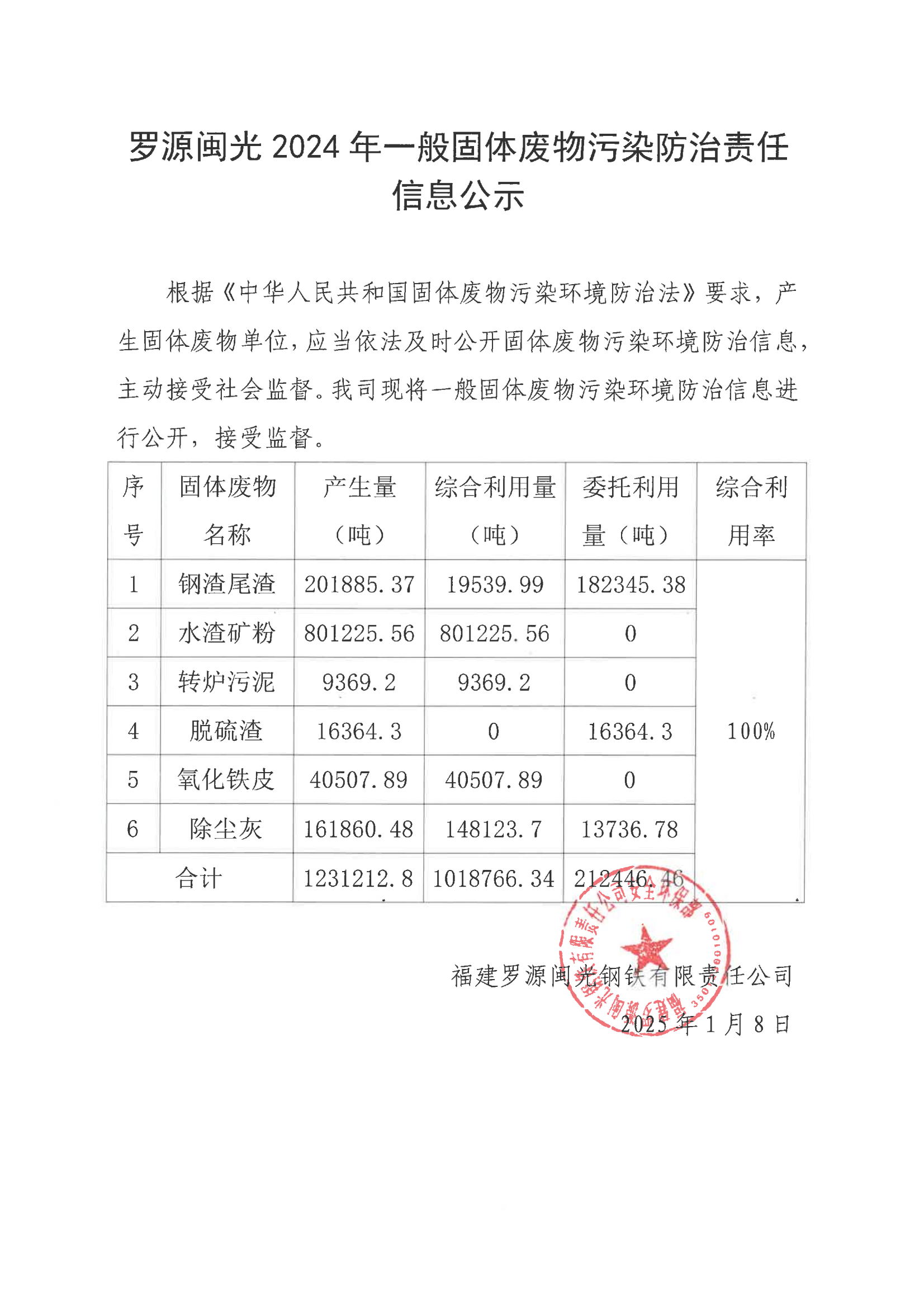 罗源闽光2024年一般固体废物污染防治责任信息公示